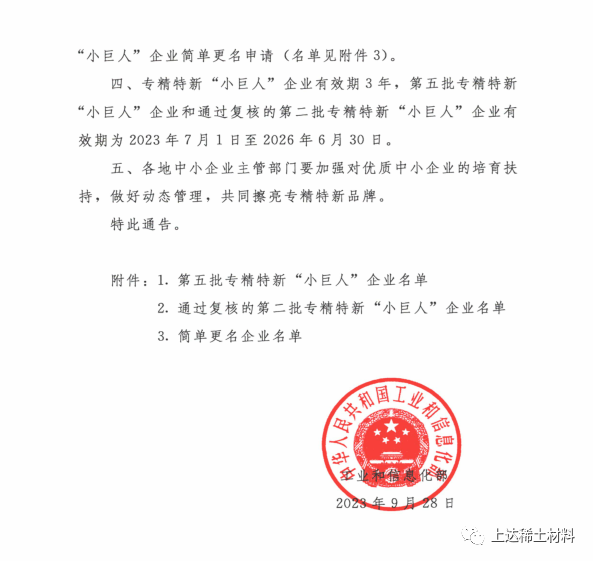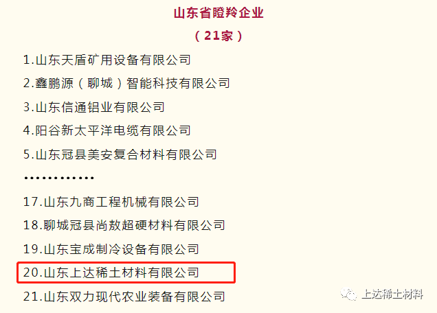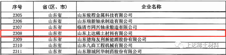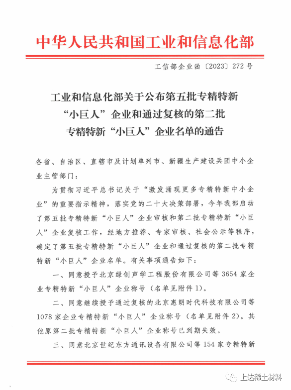 近日,國(guó)家工業(yè)和信息化部公布了第五批專(zhuān)精特新“小巨人”企業(yè)名單,聊城市新增9家國(guó)家級(jí)專(zhuān)精特新“小巨人”企業(yè),山東上達(dá)稀土材料有限公司在列,實(shí)現(xiàn)冠縣在國(guó)家級(jí)專(zhuān)精特新“小巨人”項(xiàng)目上的零突破。